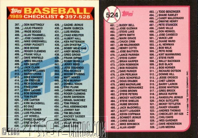 1989 Topps Checklist Tiffany 524